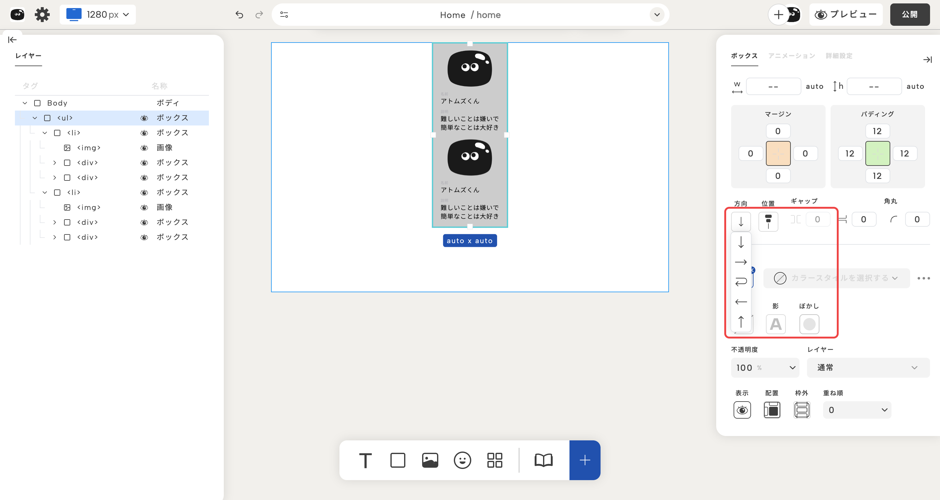 これで、子要素を横に並べるか、縦に並べるかを決められるんだ。