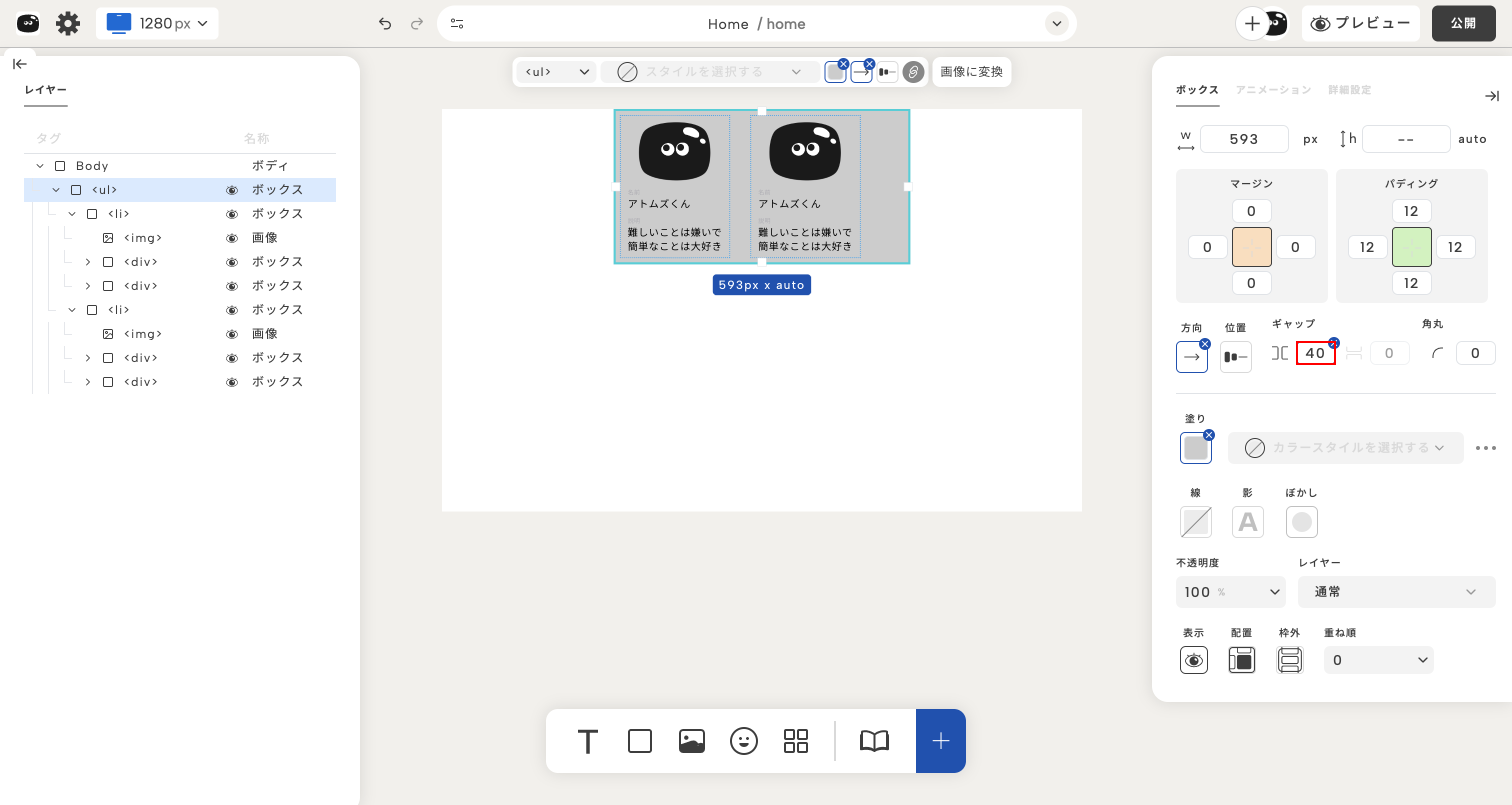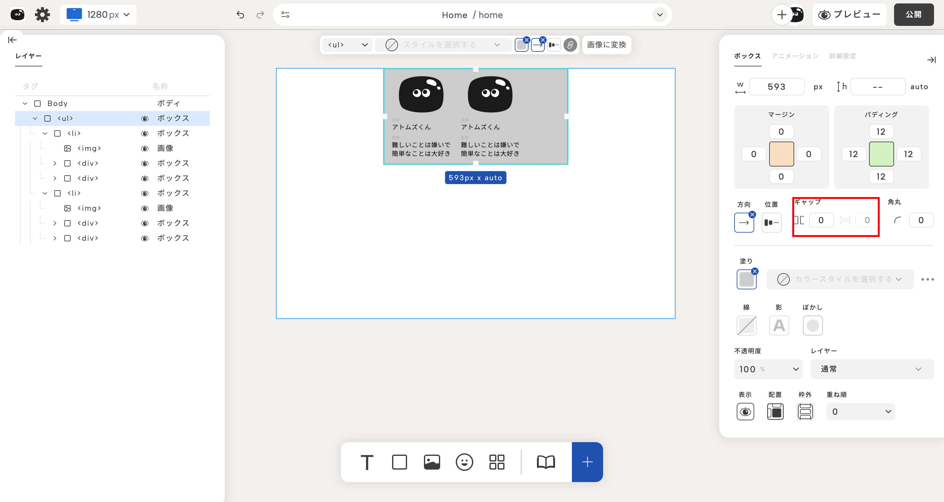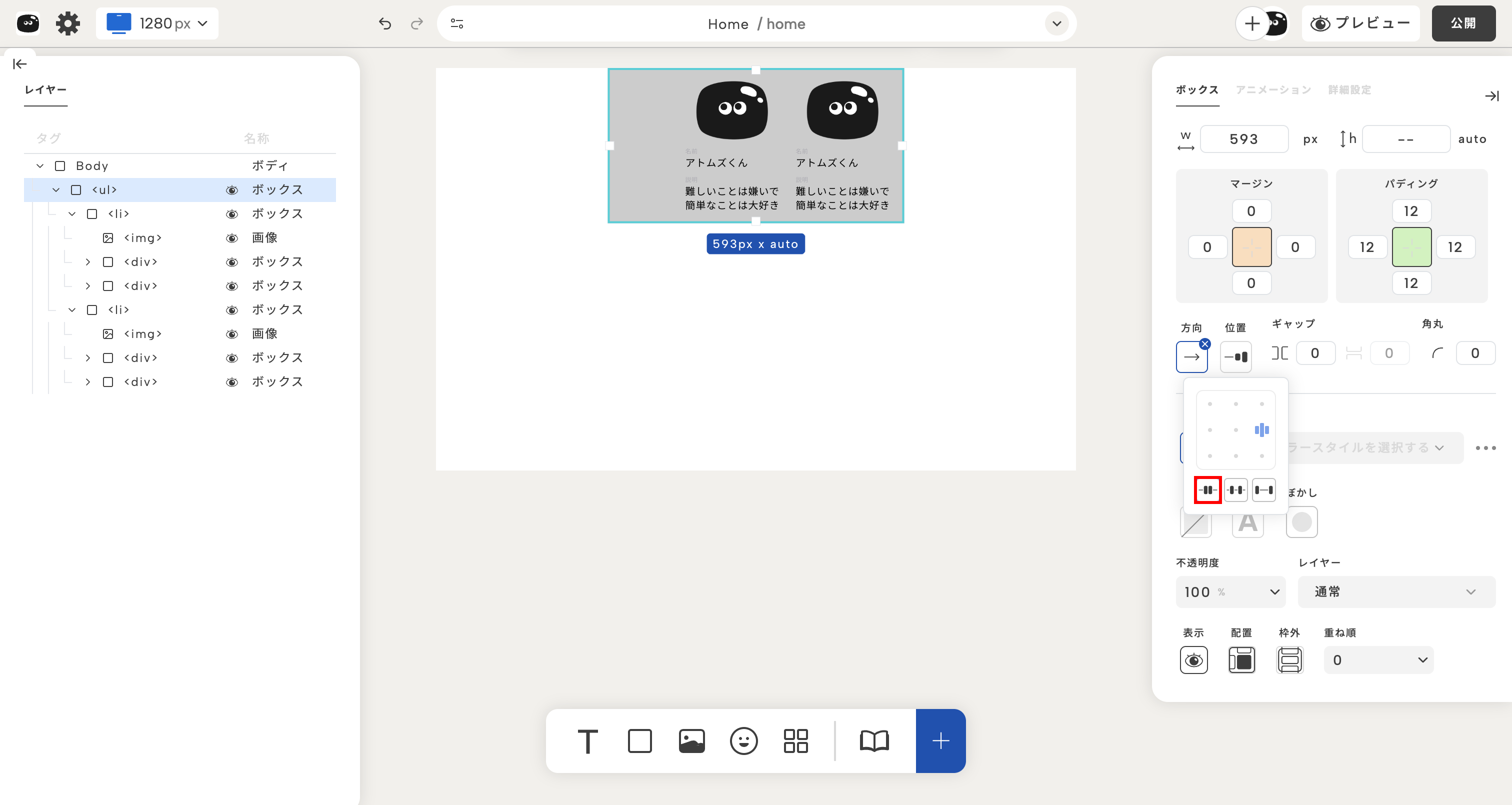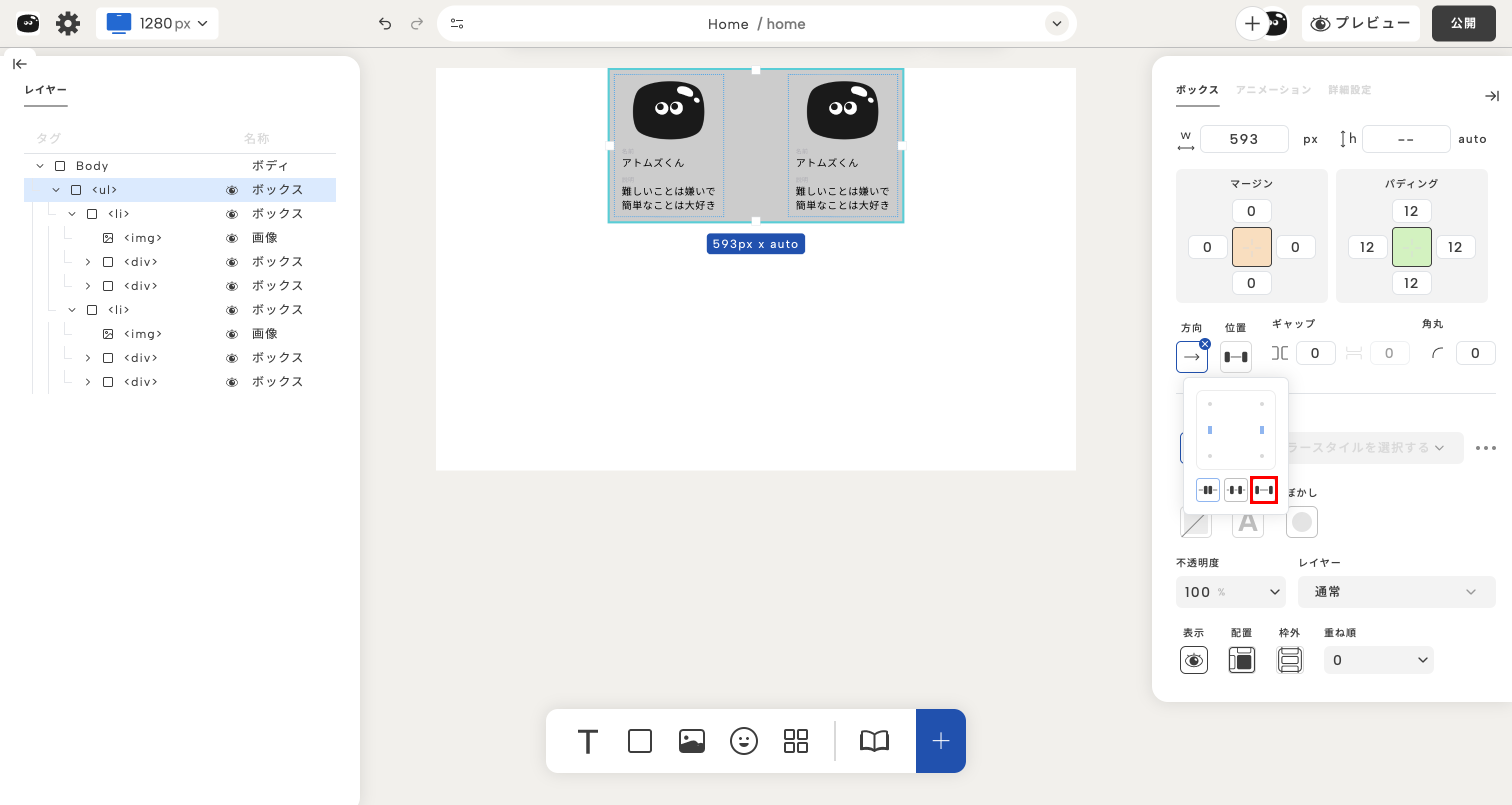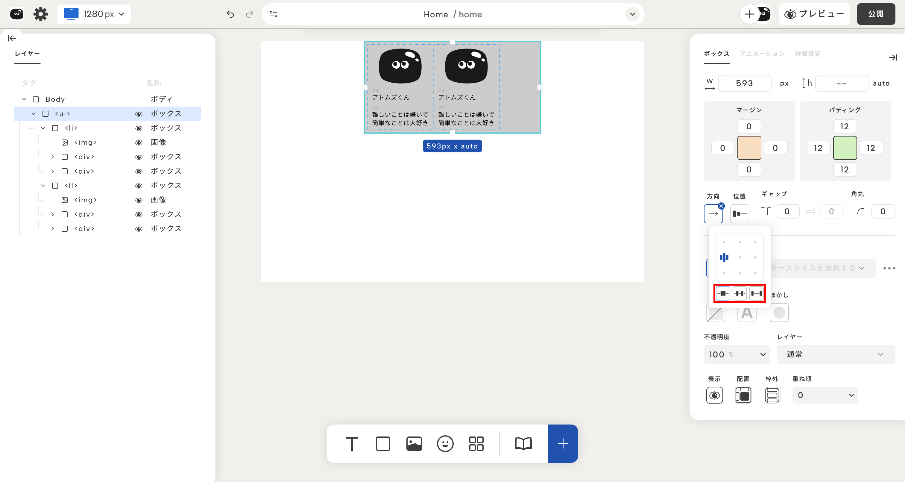 ボックスのレイアウト設定を使えば、自由に並び方を制御できるよ!
