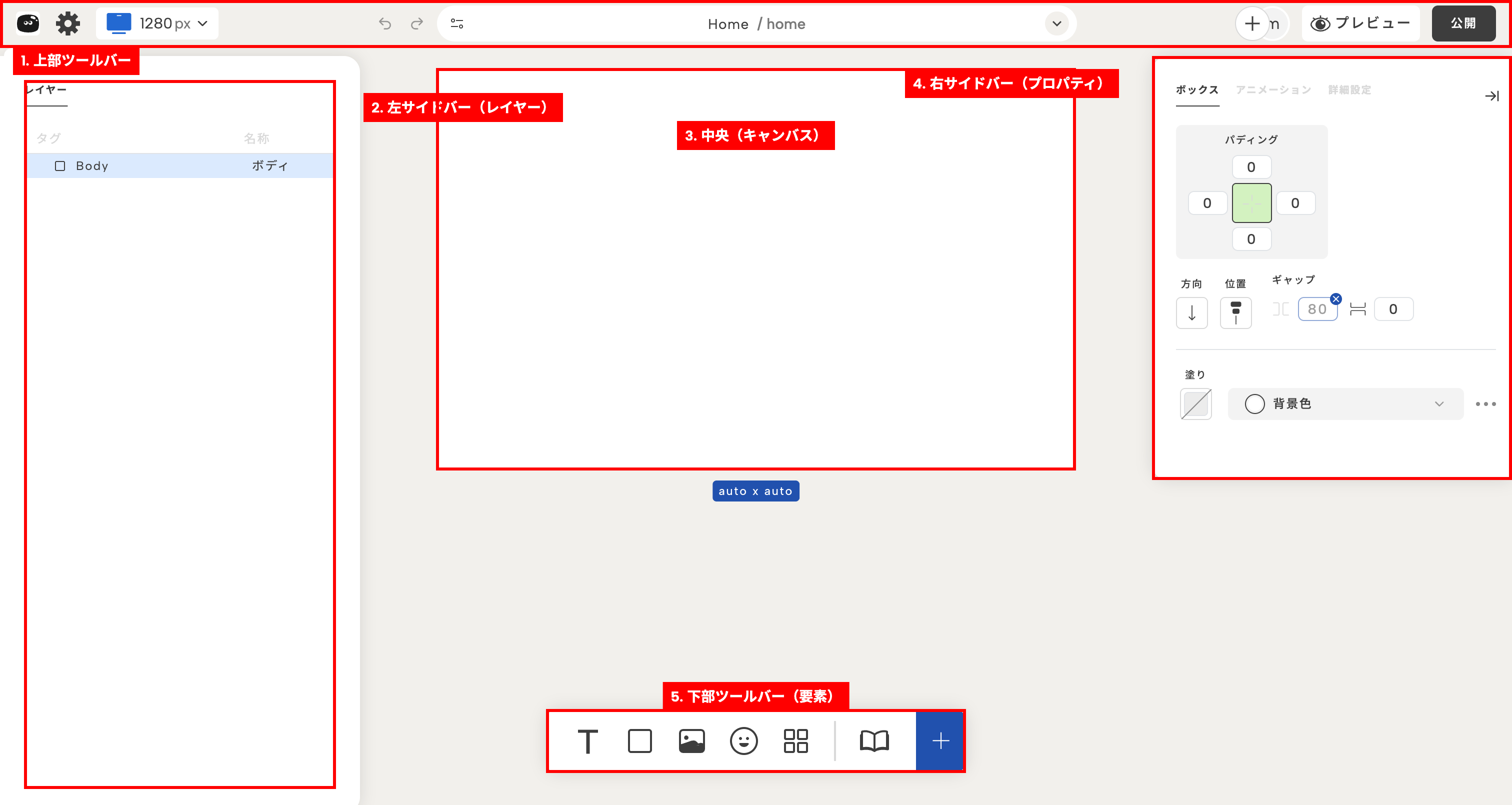 | キャンバス(中央) | 実際にデザインを編集する領域 |