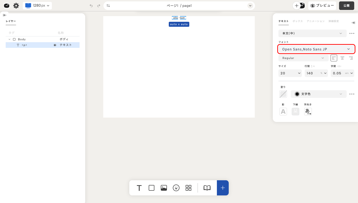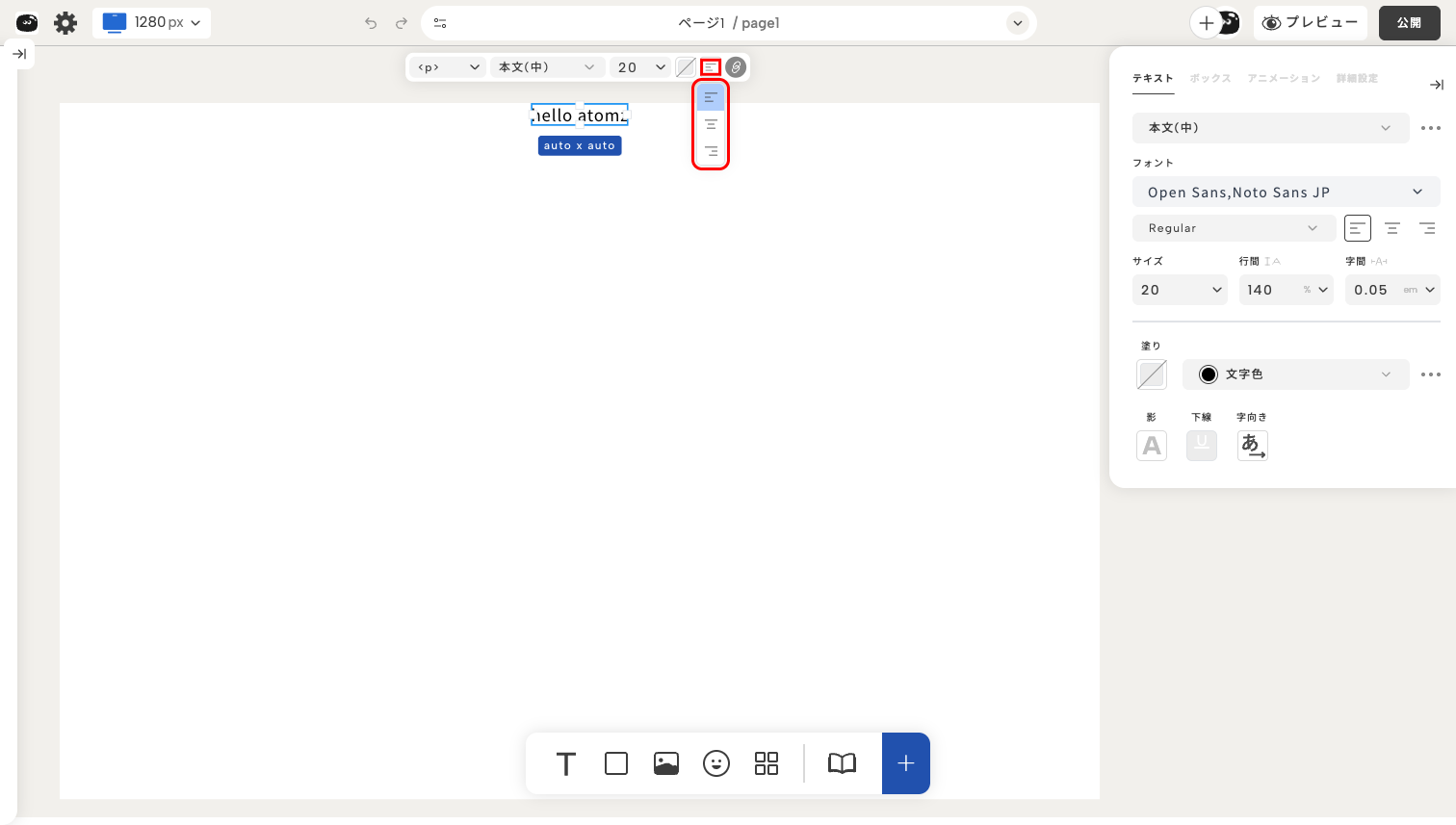 テキストの基本設定を使えば、フォント、サイズ、太さ、配置など、